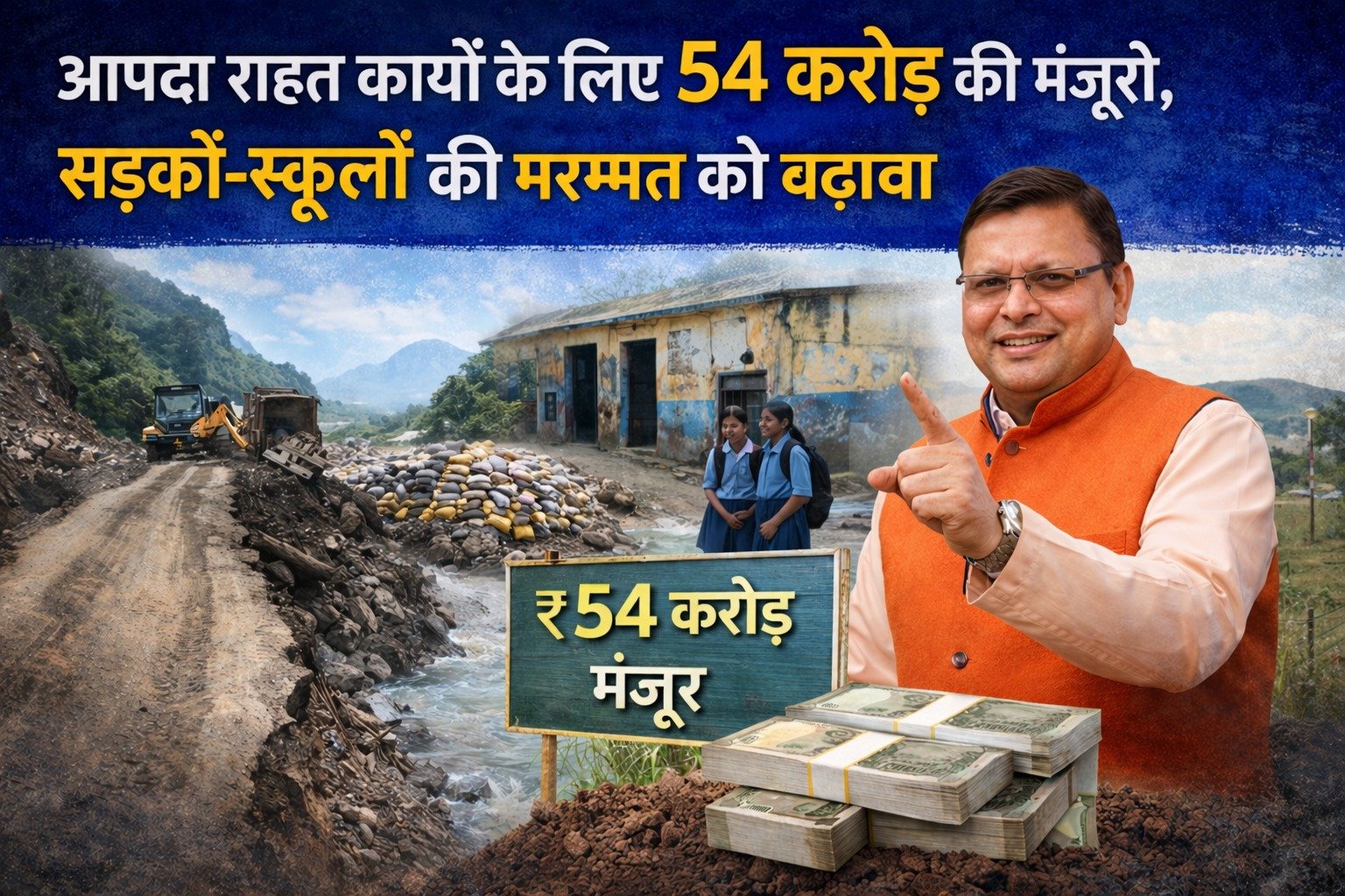 मुख्यमंत्री ने आपदा मोचन निधि के अन्तर्गत क्षतिग्रस्त सडकों की मरम्मत, आर्थिक सहायता के साथ ही बाढ सुरक्षा कार्यो, सडकों के निर्माण, स्कूलोें की मरम्मत, नहरों व गूलों के निर्माण आदि के लिए प्रदान की ₹ 54 करोड वित्तीय स्वीकृति