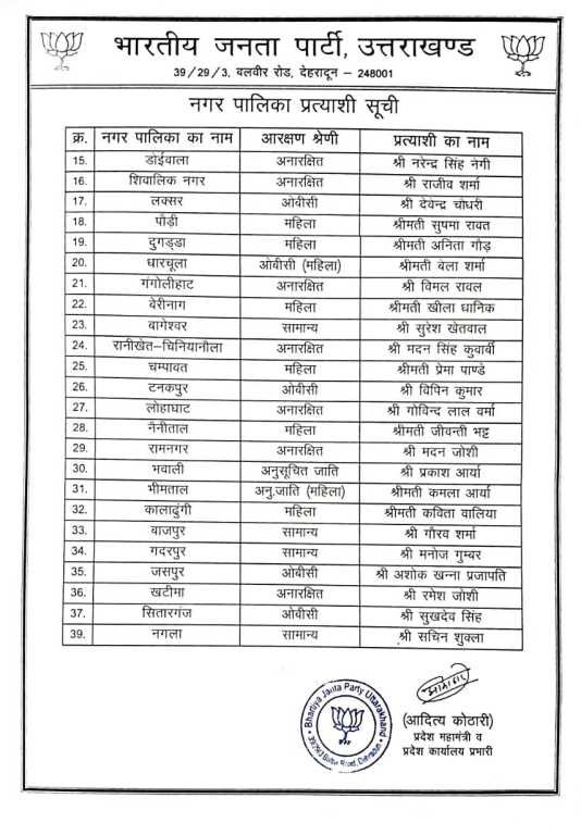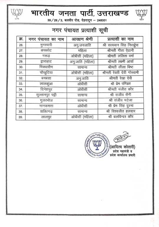 Home राज्य समाचार उत्तराखण्ड भाजपा ने निकाय चुनाव में अध्यक्ष पद के प्रत्याशी किये घोषित,देखें सूची। राज्य समाचारउत्तराखण्ड भाजपा ने निकाय चुनाव में अध्यक्ष पद के प्रत्याशी किये घोषित,देखें सूची। By Web Editor - December 27, 2024 130 0 FacebookTwitterPinterestWhatsApp