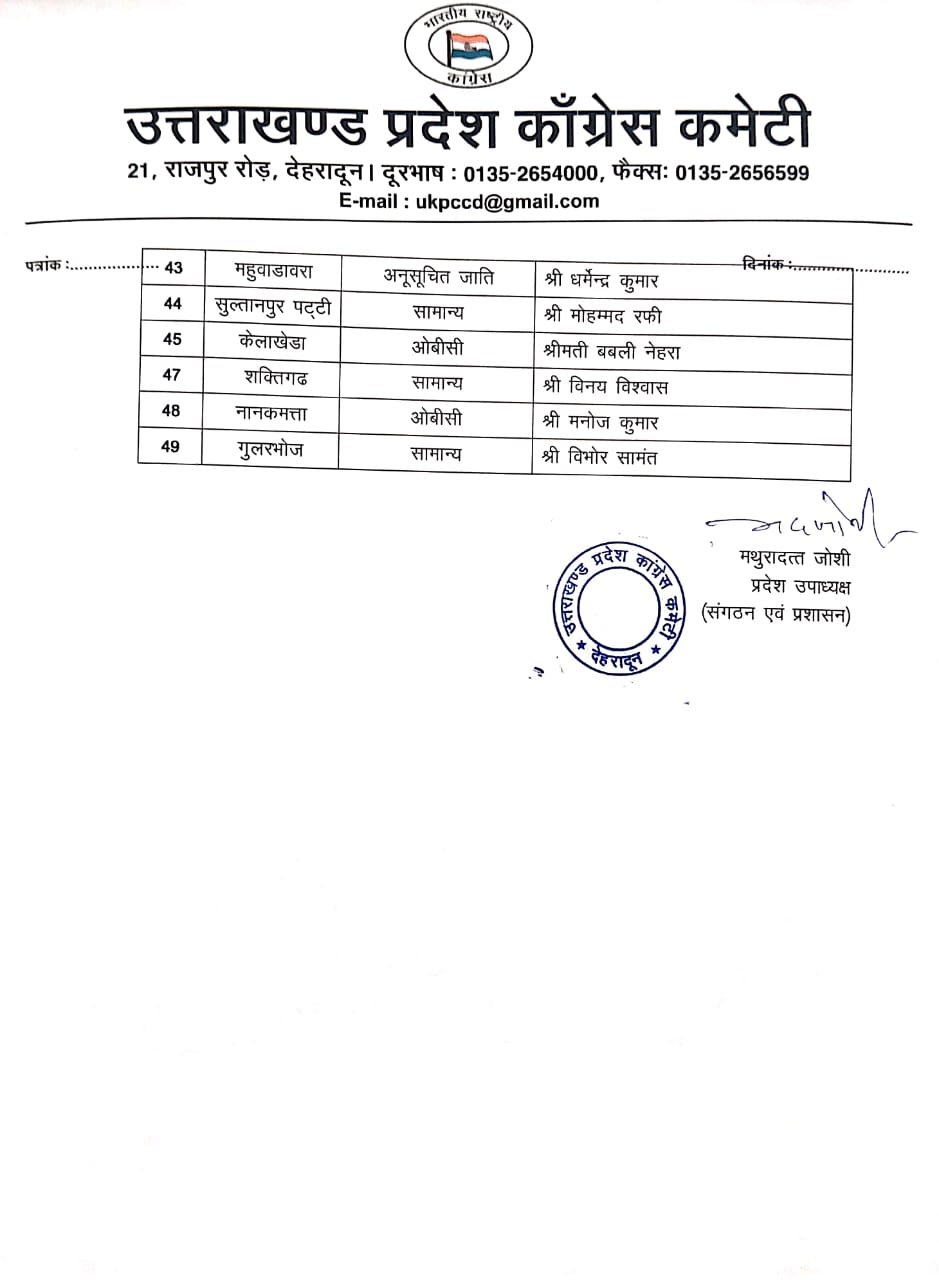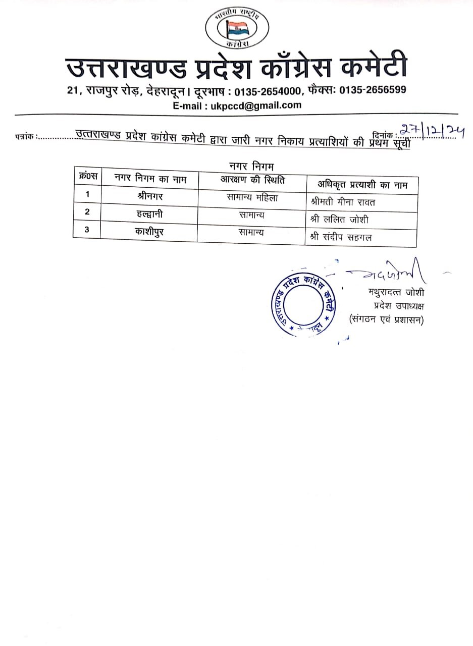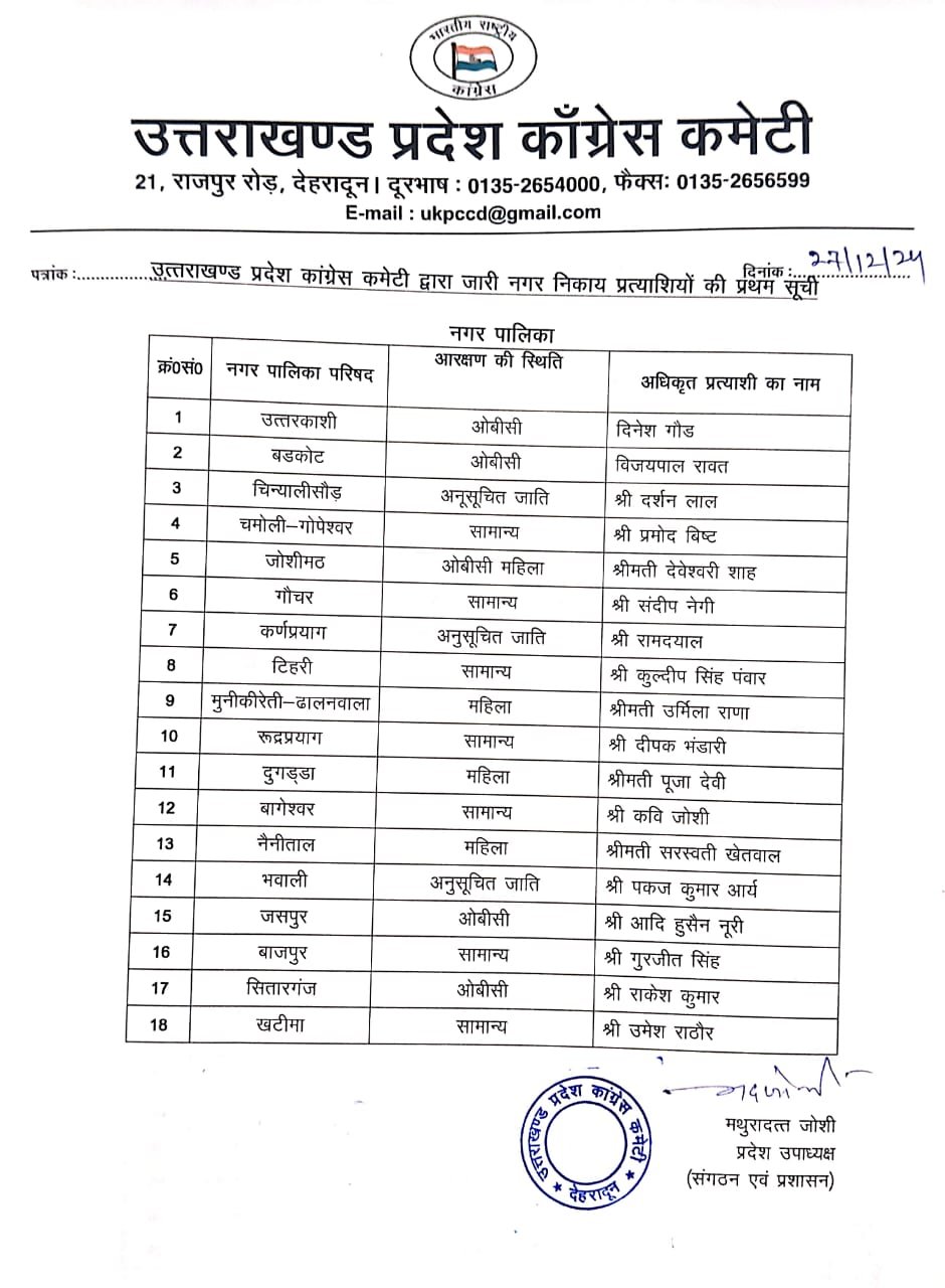 कांग्रेस पार्टी ने नगर निकाय चुनाव के लिए पहली सूची जारी की,पार्टी के निष्ठावान कार्यकर्ताओं को दी जाएगी तरजीह. मथुरादत्त जोशी