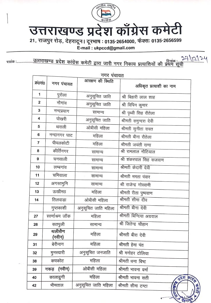 जानकारी देते हुए प्रदेश कांग्रेस उपाध्यक्ष मथुरादत्त जोशी ने पहली सूची जारी करते हुए कहा कि पार्टी संगठन द्वारा निष्ठावान एवं समर्पित कार्यकर्ताओं को तरजीह दी गई है। उन्होंने कहा कि कल यानी रविवार को अगली सूची जारी की जायेगी।