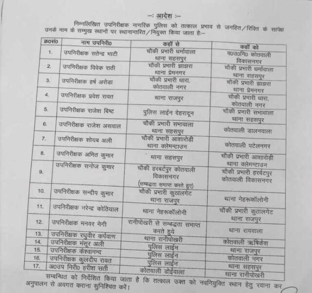 Home राज्य समाचार उत्तराखण्ड देहरादून SSP ने कर डाले बम्पर तबादले देखिए LIST राज्य समाचारउत्तराखण्ड देहरादून SSP ने कर डाले बम्पर तबादले देखिए LIST By Web Editor - February 9, 2025 98 0 FacebookTwitterPinterestWhatsApp *आज दिनांक 08/02/2025 को वरिष्ठ पुलिस अधीक्षक देहरादून द्वारा निम्न निरीक्षक/उप निरीक्षकों के स्थानांतरण उनके नाम के सम्मुख अंकित स्थानों पर किए गए।*