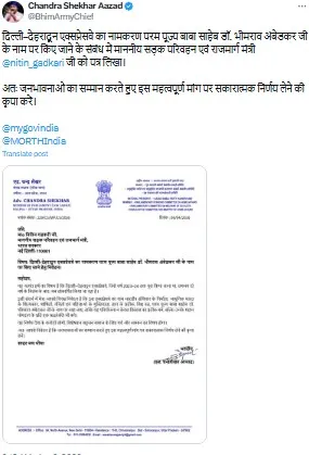 दरअसल, नगीना से सांसद और आजाद समाज पार्टी (कांशी राम) के राष्ट्रीय अध्यक्ष चंद्र शेखर आजाद ने केंद्रीय सड़क परिवहन और राजमार्ग मंत्री नितिन गडकरी को एक पत्र लिखा है. जिसमें उन्होंने ‘दिल्ली-देहरादून एक्सप्रेसवे’ का नाम ‘बाबा साहेब डॉ. भीमराव अंबेडकर’ के नाम पर रखने का अनुरोध किया है. जिसके बाद इस एक्सप्रेसवे के नाम को लेकर चर्चाएं तेज हो गई. हालांकि, अभी तक आधिकारिक रूप से इसका कोई नाम तय नहीं हुआ है, लेकिन उद्धाटन से पहले इस एक्सप्रेसवे के नामकरण को लेकर चर्चा छिड़ गई है.