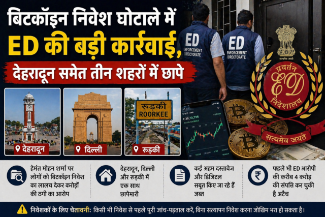 उत्तराखंड में कथित बिटकॉइन निवेश घोटाले को लेकर प्रवर्तन निदेशालय (ED) ने बड़ी कार्रवाई करते हुए देहरादून, दिल्ली और रुड़की में एक साथ छापेमारी की है। इस दौरान आरोपी हेमंत मोहन शर्मा के ठिकानों को खंगाला जा रहा है।