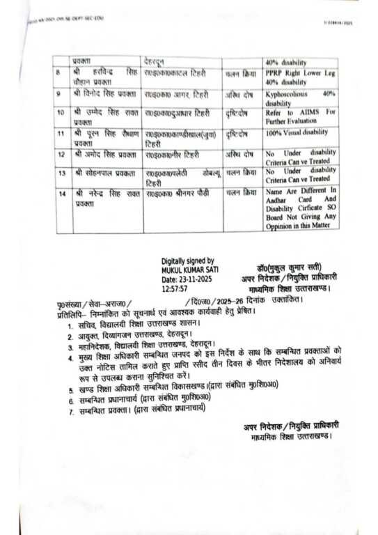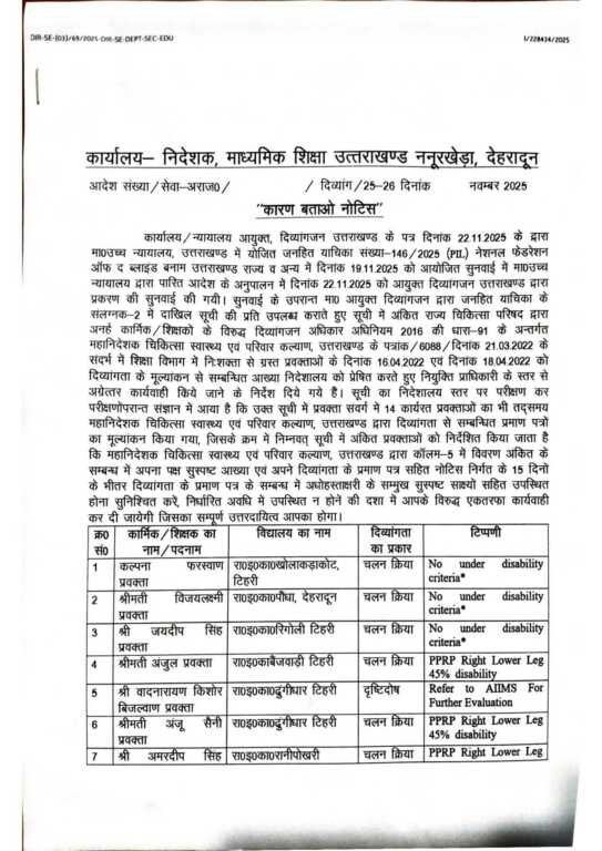 कार्यालय / न्यायालय आयुक्त, दिव्यांगजन उत्तराखण्ड के पत्र दिनांक 22.11.2025 के द्वारा मा०उच्च न्यायालय, उत्तराखण्ड में योजित जनहित याचिका संख्या-146/2025 (PIL) नेशनल फेडरेशन ऑफ द ब्लाइंड बनाम उत्तराखण्ड राज्य व अन्य में दिनांक 19.11.2025 को आयोजित सुनवाई में मा० उच्च न्यायालय द्वारा पारित आदेश के अनुपालन में दिनांक 22.11.2025 को आयुक्त दिव्यांगजन उत्तराखण्ड द्वारा प्रकरण की सुनवाई की गयी। सुनवाई के उपरान्त मा० आयुक्त दिव्यांगजन द्वारा जनहित याचिका के संलग्नक-2 में दाखिल सूची की प्रति उपलब्ध कराते हुए सूची में अंकित राज्य चिकित्सा परिषद द्वारा अनर्ह कार्मिक / शिक्षकों के विरुद्ध दिव्यांगजन अधिकार अधिनियम 2016 की धारा-91 के अन्तर्गत महानिदेशक चिकित्सा स्वास्थ्य एवं परिवार कल्याण, उत्तराखण्ड के पत्रांक/6088/ दिनांक 21.03.2022 के संदर्भ में शिक्षा विभाग में निःशक्ता से ग्रस्त प्रवक्ताओं के दिनांक 16.04.2022 एवं दिनांक 18.04.2022 को दिव्यांगता के मूल्यांकन से सम्बन्धित आख्या निदेशालय को प्रेषित करते हुए नियुक्ति प्राधिकारी के स्तर से अग्रेत्तर कार्यवाही किये जाने के निर्देश दिये गये हैं। सूची का निदेशालय स्तर पर परीक्षण कर परीक्षणोपरान्त संज्ञान में आया है कि उक्त सूची में प्रवक्ता संवर्ग में 14 कार्यरत प्रवक्ताओं का भी तद्समय महानिदेशक चिकित्सा स्वास्थ्य एवं परिवार कल्याण, उत्तराखण्ड द्वारा दिव्यांगता से सम्बन्धित प्रमाण पत्रों का मूल्यांकन किया गया, जिसके क्रम में निम्नवत् सूची में अंकित प्रवक्ताओं को निर्देशित किया जाता है कि महानिदेशक चिकित्सा स्वास्थ्य एवं परिवार कल्याण, उत्तराखण्ड द्वारा कॉलम 5 में विवरण अंकित के सम्बन्ध में अपना पक्ष सुस्पष्ट आख्या एवं अपने दिव्यांगता के प्रमाण पत्र सहित नोटिस निर्गत के 15 दिनों के भीतर दिव्यांगता के प्रमाण पत्र के सम्बन्ध में अधोहस्ताक्षरी के सम्मुख सुस्पष्ट साक्ष्यों सहित उपस्थित होना सुनिश्चित करें, निर्धारित अवधि में उपस्थित न होने की दशा में आपके विरुद्ध एकतरफा कार्यवाही कर दी जायेगी जिसका सम्पूर्ण उत्तरदायित्व आपका होगा।