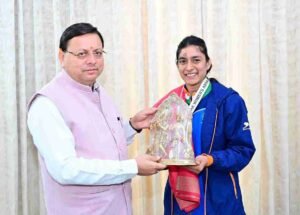 मुख्यमंत्री पुष्कर सिंह धामी से रविवार को मुख्यमंत्री आवास में एशियाई चैंपियंस ट्रॉफी विजेता महिला हॉकी टीम की सदस्य हरिद्वार निवासी मनीषा चौहान ने शिष्टाचार भेंट की। इस दौरान मनीषा के साथ उनके माता पिता एवं कोच भी मौजूद रहे।