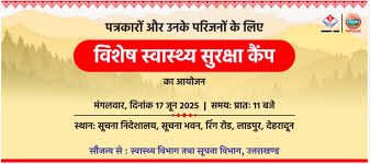 मुख्यमंत्री पुष्कर सिंह धामी के निर्देश के क्रम में मंगलवार 17 जून को स्वास्थ्य और सूचना विभाग की ओर से पत्रकारों और उनके परिजनों की निःशुल्क स्वास्थ्य जांच के लिए, विशेष स्वास्थ्य सुरक्षा कैम्प का आयोजन किया जा रहा है। इसमें राजकीय दून मेडिकल कॉलेज के वरिष्ठ चिकित्सकों द्वारा जांच के साथ ही परामर्श भी प्रदान किया जाएगा।