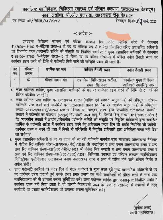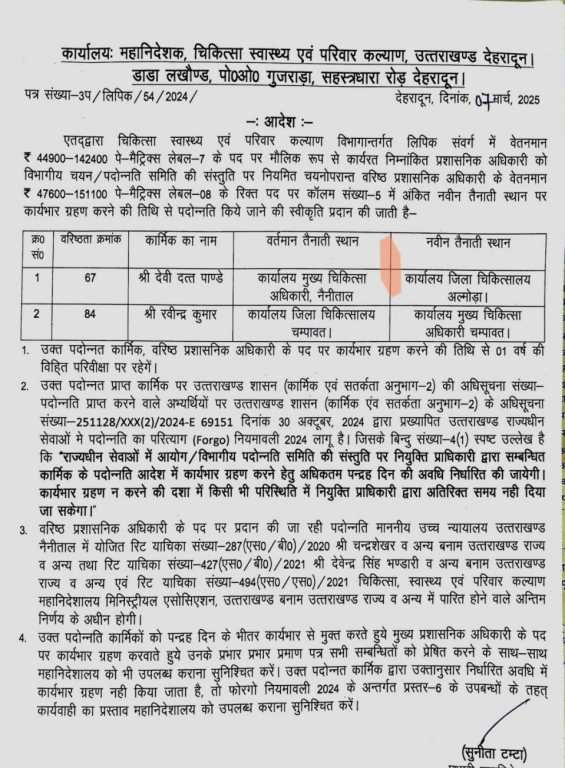 स्वास्थ्य विभाग में विभिन्न पदों पर प्रमोशन
