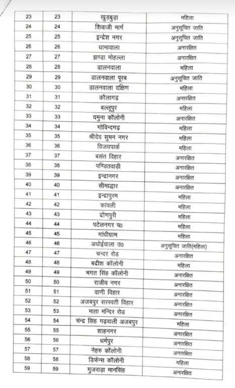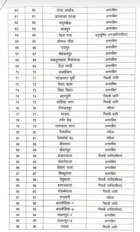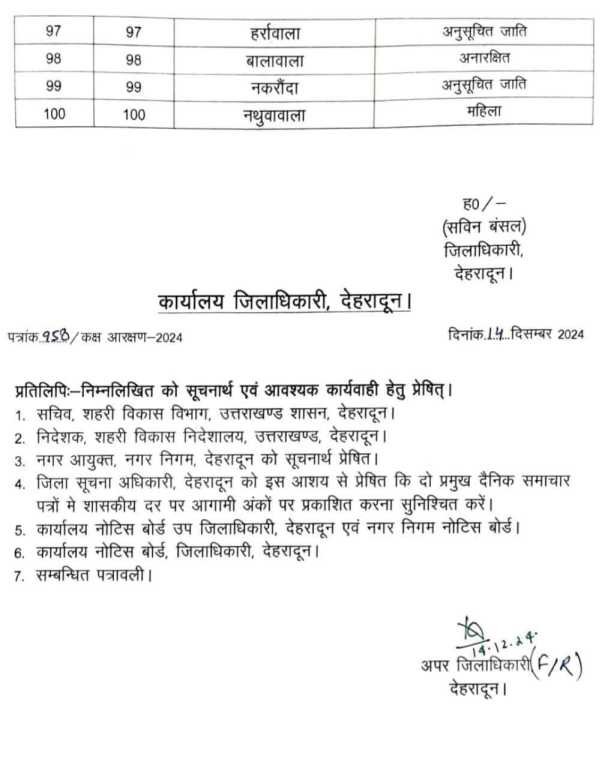 शहरी विकास विभाग, उत्तराखण्ड शासन, देहरादून के पत्र संख्या-1495/IV(3)/2024-11 (03निर्वा०)/2024 दिनांक 12.12.2024 मे दिये गये निर्देशों के क्रम मे उत्तराखण्ड नगर निगम (स्थानों एवं पदों का आरक्षण और आवंटन) नियमावली-2024 मे दिये गये प्रविधानों के अंतर्गत नगर निगम, देहरादून, जनपद देहरादून हेतु कक्षवार स्थानों का आरक्षण एवं आवंटन