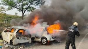 भगत सिंह चौक के पास अचानक दो कारों में आग लगने में हड़कंप, दमकल कर्मियों ने बमुश्किल बुझाई