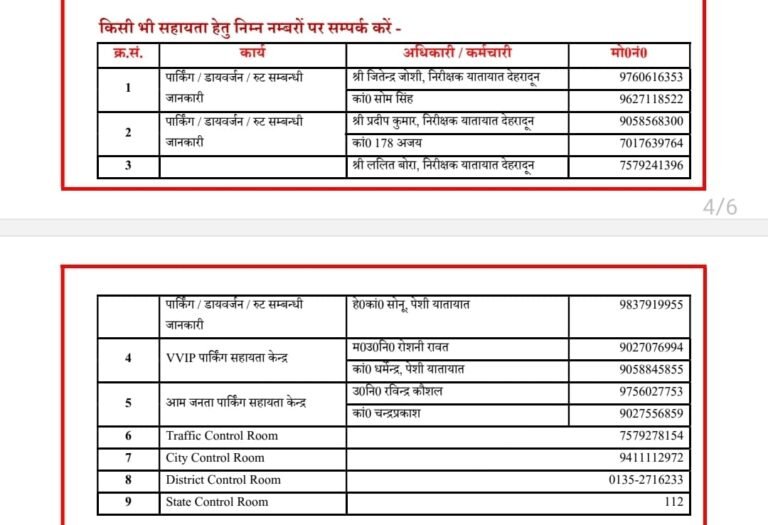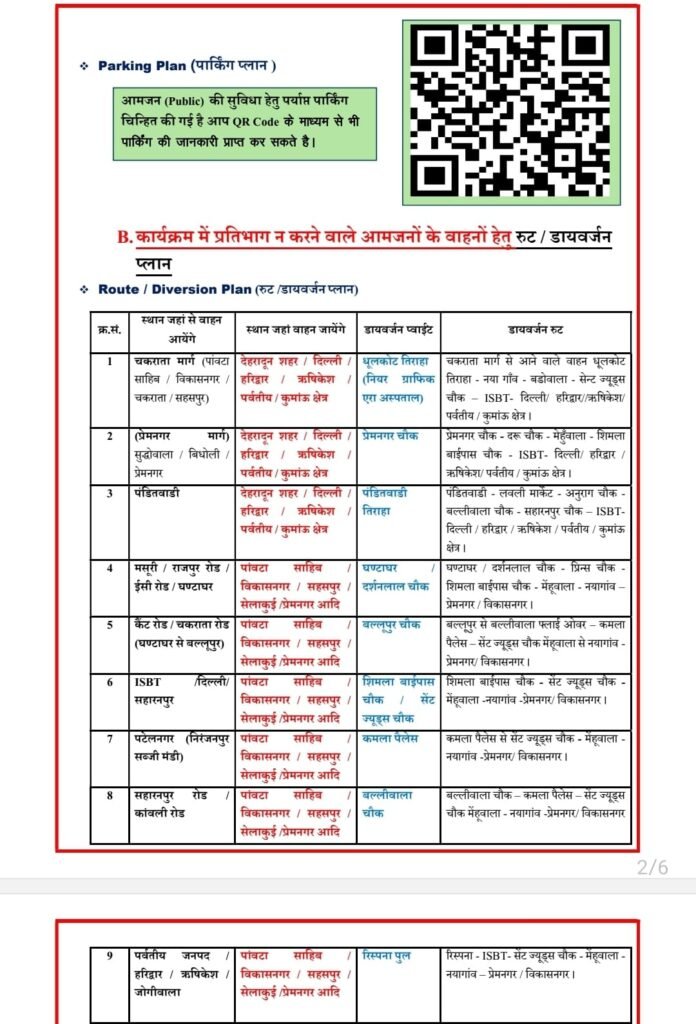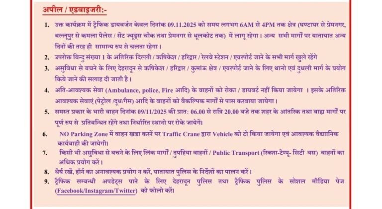 दून पुलिस के ट्रैफिक प्लान के अनुसार ट्रैफिक प्लान 09 नवंबर को सुबह 06 बजे से रात 08 बजे तक प्रभावी रहेगा। इस दौरान सभी प्रकार के भारी वाहन शहर के आंतरिक और बाहरी मार्गों पर प्रवेश नहीं कर पाएंगे। हालांकि, रूट डायवर्जन प्लान शाम 04 बजे तक ही लागू रहेगा।