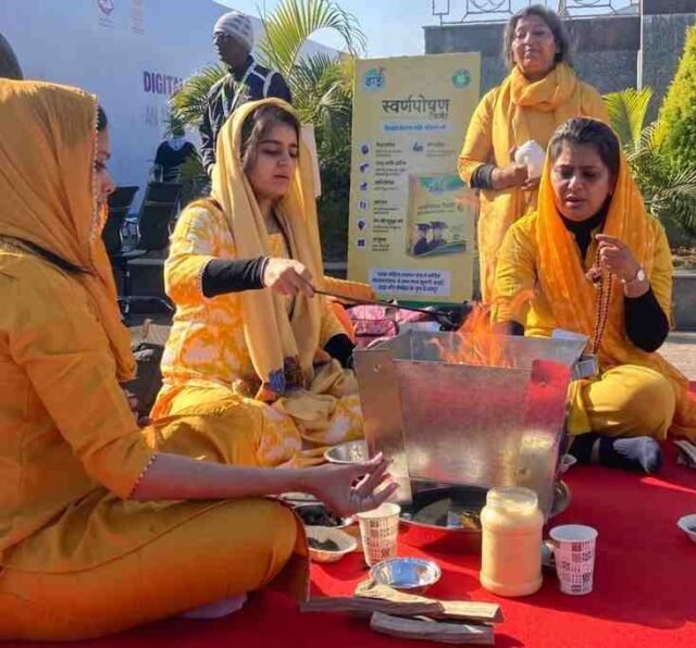 विश्व आयुर्वेद कांग्रेस की शुरुआत के साथ ही ध्यान फाउंडेशन की साधिकाओं ने हवन किया