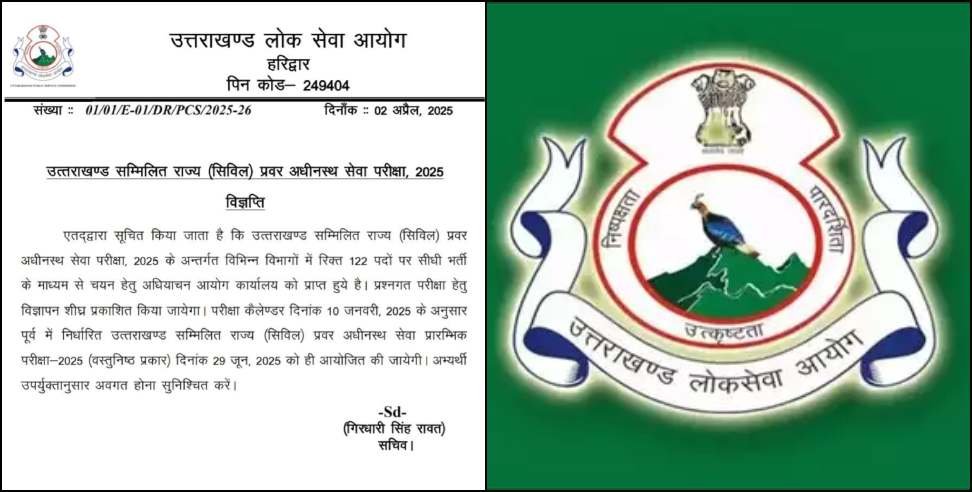 उत्तराखंड सम्मिलित राज्य (सिविल) प्रवर अधीनस्थ सेवा परीक्षा 2025 के तहत विभिन्न विभागों में 122 रिक्त पदों पर सीधी भर्ती के लिए आयोग कार्यालय को आवेदन प्राप्त हुए हैं। पीसीएस परीक्षा के लिए जल्द ही विज्ञापन जारी किया जाएगा। परीक्षा कैलेंडर के अनुसार, 10 जनवरी 2025 को निर्धारित उत्तराखंड सम्मिलित राज्य (सिविल) प्रवर अधीनस्थ सेवा प्रारंभिक परीक्षा 2025 का वस्तुनिष्ठ परीक्षा का आयोजन 29 जून 2025 को किया जाएगा।